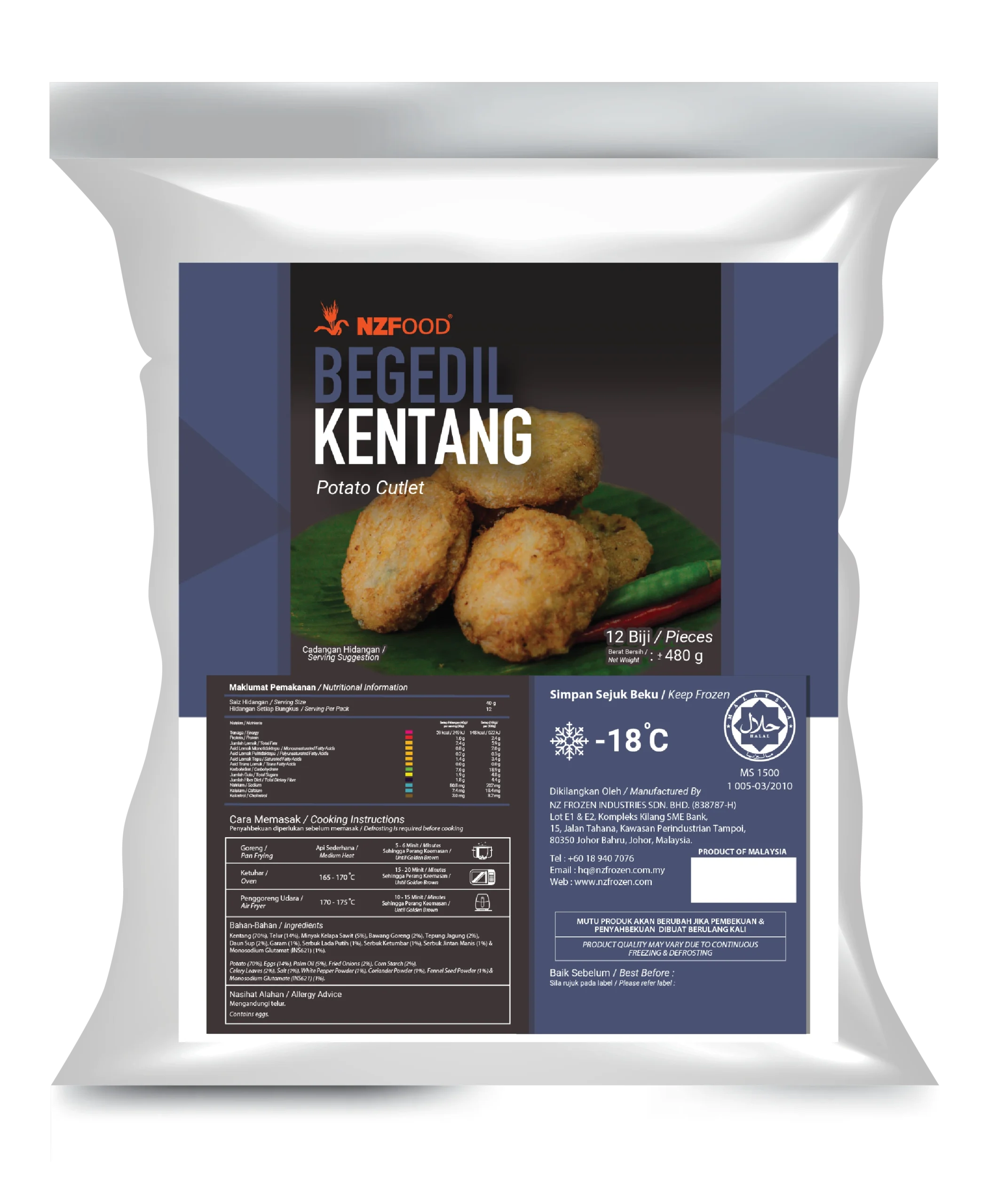 Potato (70%), Egg (14%), Palm Oil (5%), Fried Shallot (2%), Cornstarch (2%), Chinese Celery (2%), Salt (1%), White Pepper Powder (1%), Coriander Powder(1%), Fennel Powder (1%) & Monosodium Glutamate (INS621) (1%).