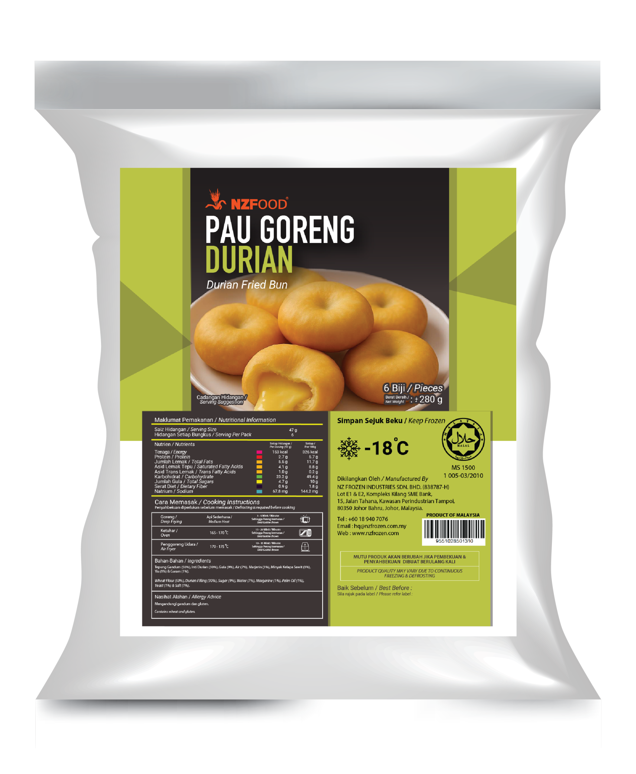 NZFood Pau Goreng Durian features a soft and fluffy bun filled with rich, creamy durian. Each piece fries to a golden, slightly crispy exterior while keeping the filling warm, melty, and irresistibly aromatic.